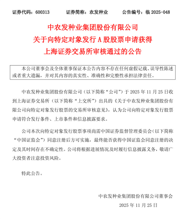 11月25日,中农发种业集团股份有限公司(下称“农发种业”)发布关于向特定对象发行A股股票申请获得上海证券交易所审核通过的公告。公告称,农发种业收到上海证券交易所(以下简称“上交所”)出具的《关于中农发种业集团股份有限公司向特定对象发行股票的交易所审核意见》,认为公司向特定对象发行股票申请符合发行条件、上市条件和信息披露要求。