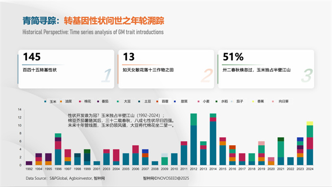 转基因(GM)仍是当下主力。玉米作为最大细分市场(占 37%),其性状开发占据历史总量的 51%。随着中国转基因玉米商业化进程的实质性推进,这一全球最大单一市场将被激活,不仅重塑亚太格局,更将为具备本土创新能力的企业提供历史性跳板。