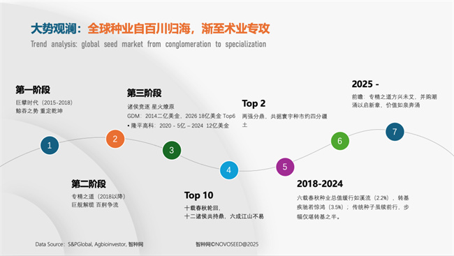 2015 至 2018 年,是全球种业的“巨擘时代”。拜耳鲸吞孟山都,中国化工整合先正达,陶氏杜邦合体后拆分出科迪华—三巨头鼎立,前两大公司一度掌控近四成全球市场。然而,这场靠资本堆砌的盛宴并未带来持久的统治力。正如 S&P Global 所揭示的,自 2018 年起,行业迅速进入“战略解绑”阶段,巨头纷纷剥离非核心或低协同资产,回归高价值赛道。