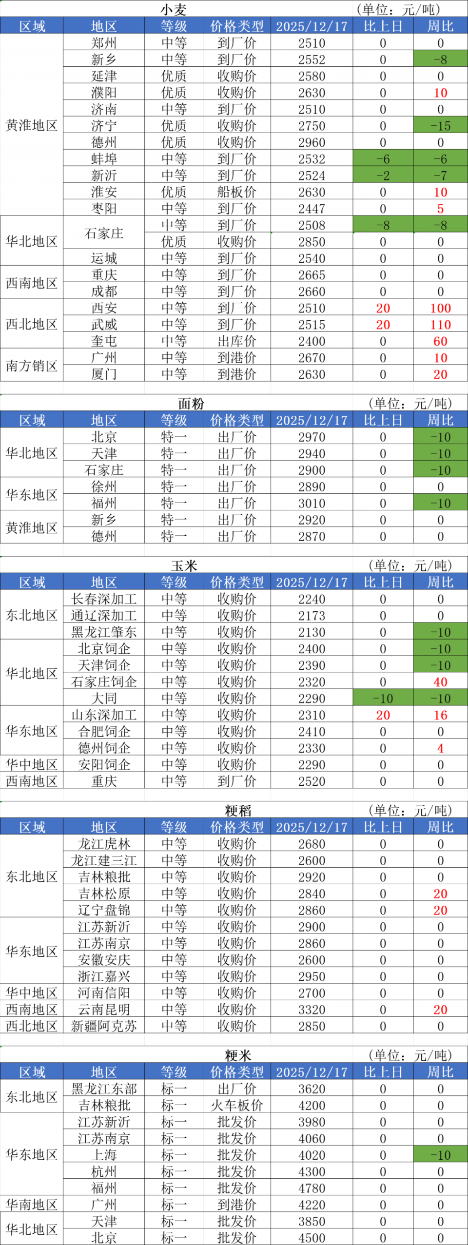 1、12月17日,小麦加工企业收购价格全线下跌,年前贸易商为偿还资金而选择出库变现,市场上小麦上量节奏加快,山东、河北、河南、江苏、安徽等主产区均有多家企业下调收购价格,跌幅在5厘以内。