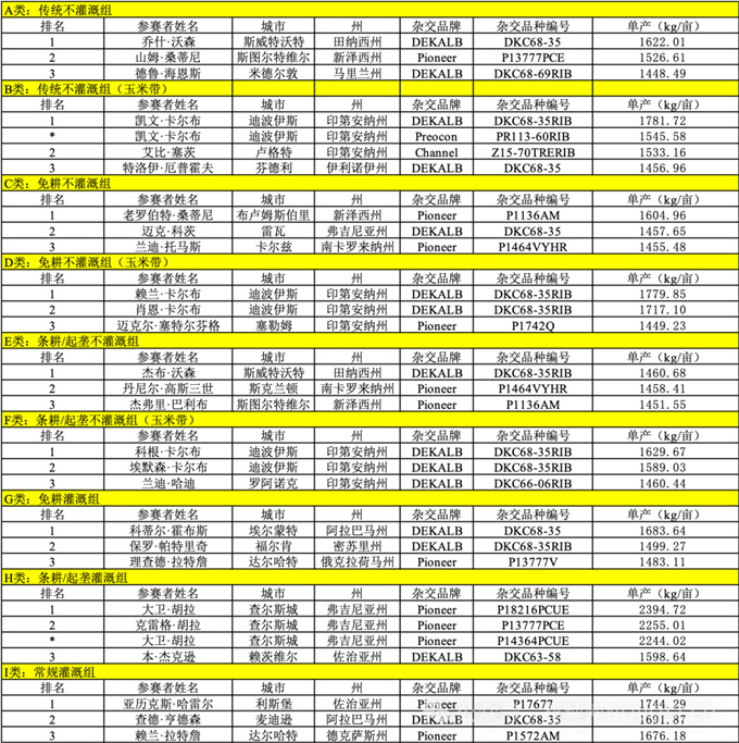 在非灌溉的传统玉米带核心区,高产同样得以实现。在B类和D类非灌溉组中,最高单产均突破了425蒲式耳/英亩(约1778.49公斤/亩)。这两个组别的优胜者均来自印第安纳州迪波伊斯的卡尔布家族——凯文·卡尔布和赖兰·卡尔布,他们选用的是DEKALB品牌的DKC68-35RIB品种。这证明了即使在不依赖灌溉的情况下,通过优秀的品种选择与耕作管理,也能达到极高的产量水平。