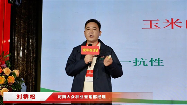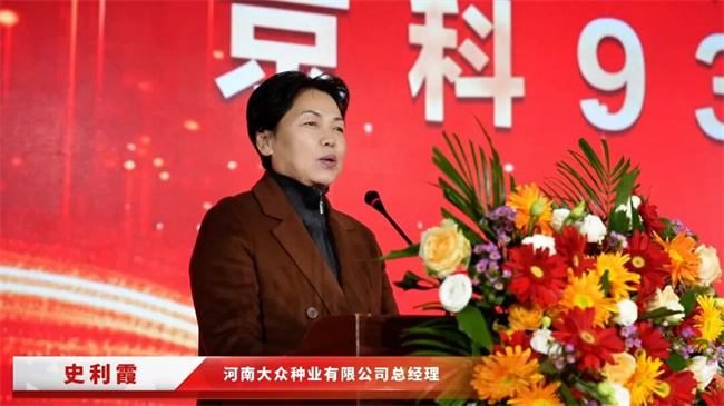 河南大众种业有限公司总经理史利霞在致辞中首先向惠郎农资团队及广大种植户表示感谢。她介绍,京科938是一个双国审品种,兼具稀植与密植适应性,自2020年审定推广以来,持续经受极端气候考验,并向市场交出了一份稳定可靠的答卷。她特别提到:2025年,京科938被农业农村部评为主推品种,连续两年被列入黄淮海夏玉米密植滴灌与单产提升技术推荐品种。