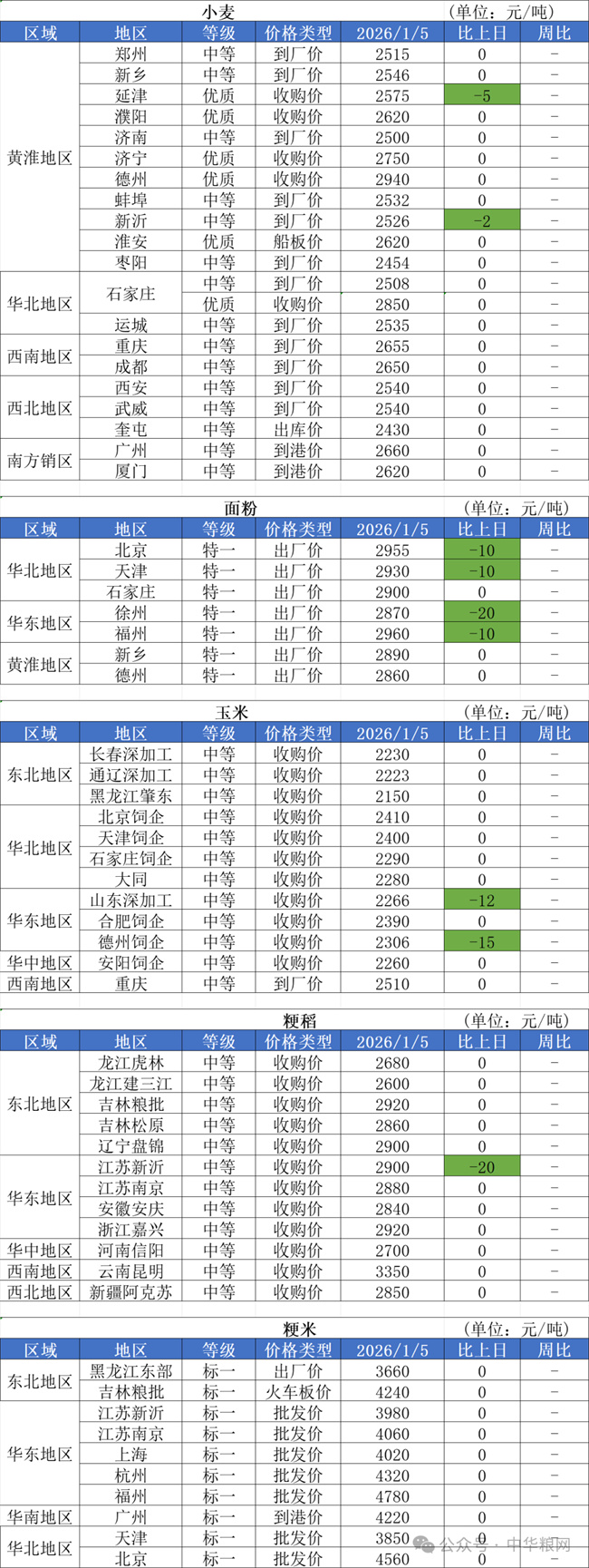1、1月5日,小麦市场价格跌多涨少,山东部分制粉企业小幅提价,河南、江苏区域部分粉企小幅降价,调整幅度在2-5厘。托市收购小麦即将开始挂牌拍卖,市场以稳中偏弱运行为主。