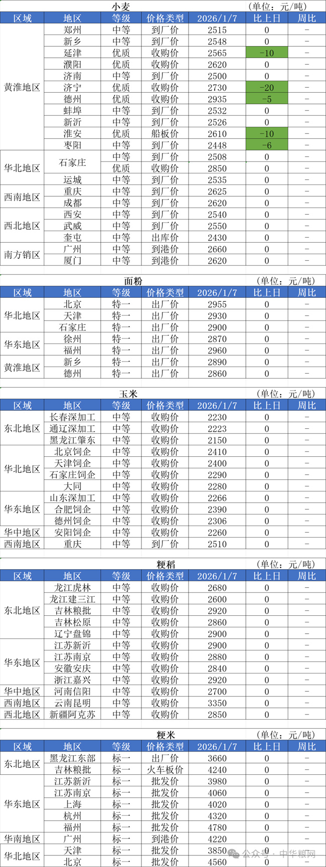 1、1月7日,最低收购价小麦计划销售198830吨,实际成交105380吨,最高成交价2470元/吨,最低成交价2320元/吨,成交均价2377.14元/吨,成交率53%。