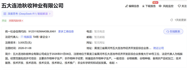 天眼查显示,近日,五大连池秋收种业有限公司成立,法定代表人为钱振国,注册资本3000万人民币,由山东秋收种业有限公司全资持股。