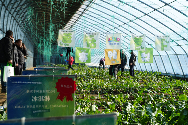 葛沽镇实验大棚里,绿缨摇曳,萝卜飘香。每一垄萝卜都有定制的标牌,清晰地展示着种源、型号和播种时间等信息。参展商们就地拔起萝卜切开展示,现场品鉴交流。
