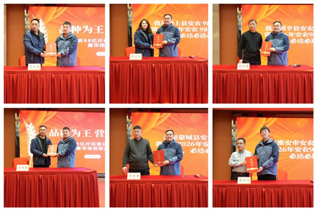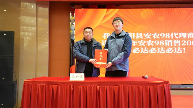 会上,来自苏皖两地的7位代理商率先响应号召,现场签订安农98销售目标任务意向合同,以实际行动开启市场攻坚。