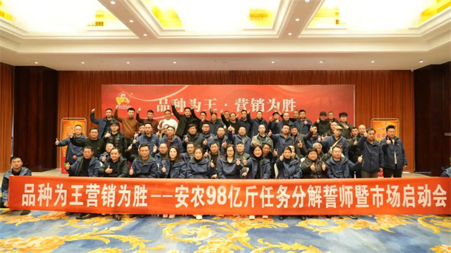 1月11日,安徽皖农种业以“品种为王·营销为胜”为主题,在宿州召开安农98亿斤任务分解誓师暨市场启动会。会议围绕安农98这一核心品种,明确亿斤目标,全面启动市场攻坚行动,进一步深化与代理商的协同合作,加快小麦市场布局步伐。