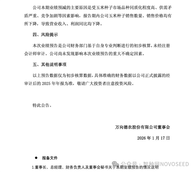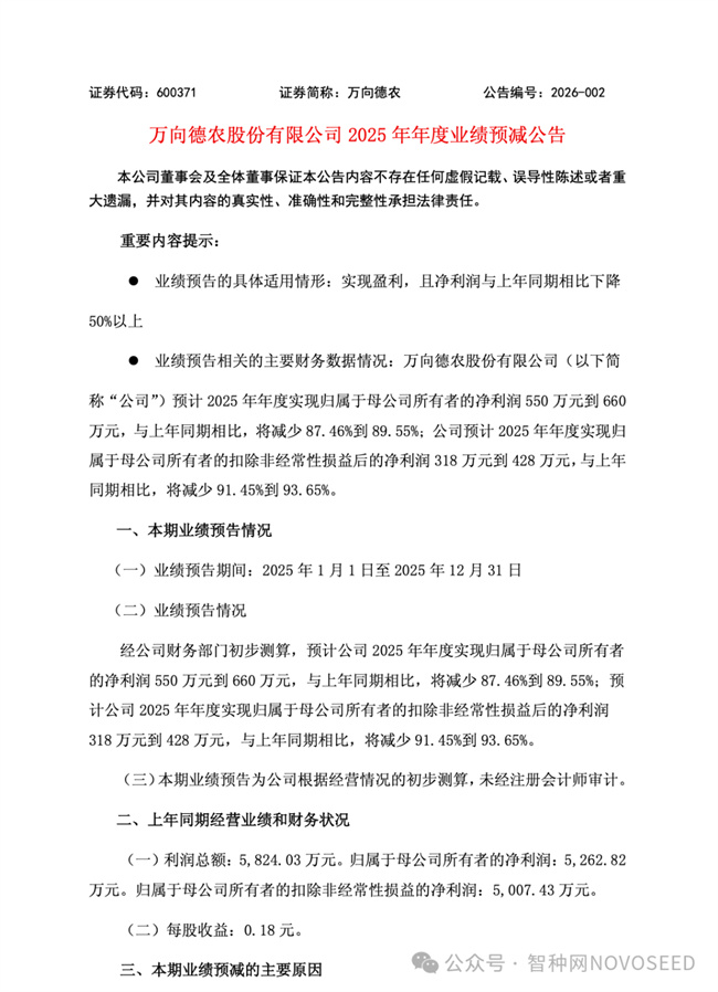 万向德农股份有限公司2025年年度业绩预减公告,表面看是一份财务层面的“断崖式下跌”,实质上却是当前玉米种子行业整体困境的一次集中暴露。