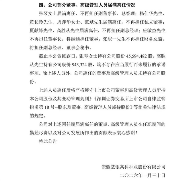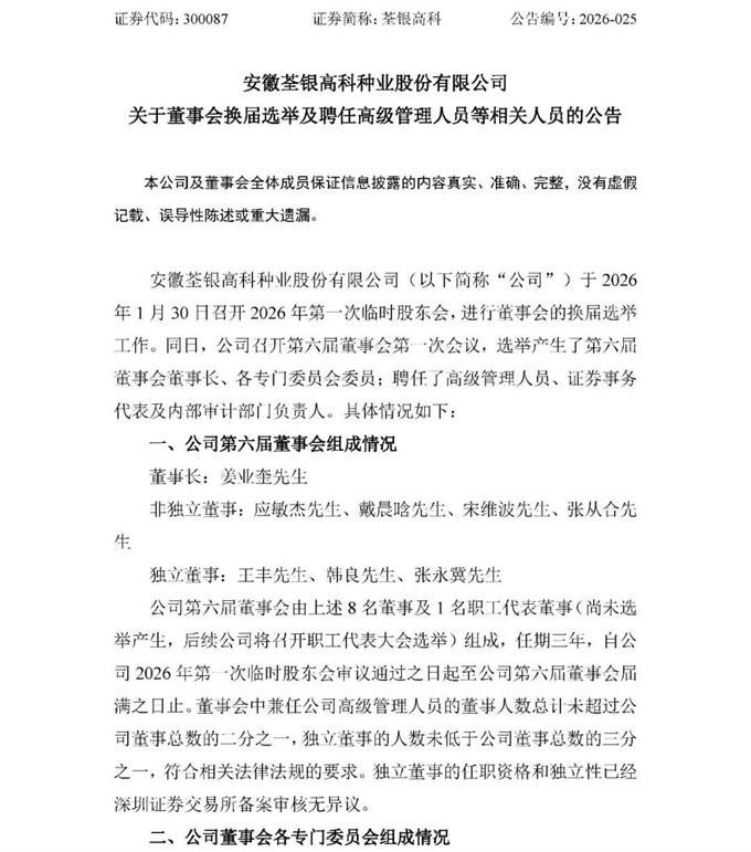 值得关注的是,同一天荃银高科召开2026年第一次临时股东会,选举产生了5名非独立董事和3名独立董事,并于当天召开董事会,完成了新一届董事长、专门委员会及高级管理人员的选举及聘任。