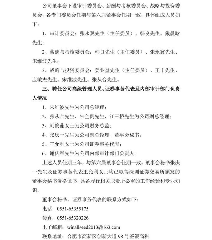 从公司了解到,本次换届后,荃银高科董事长更换为现任中种集团执行董事姜业奎,宋维波被聘任为荃银高科总经理;张从合、朱全贵、江三桥为公司副总经理;刘俊茹为公司财务总监;张庆一为公司副总经理、董事会秘书。