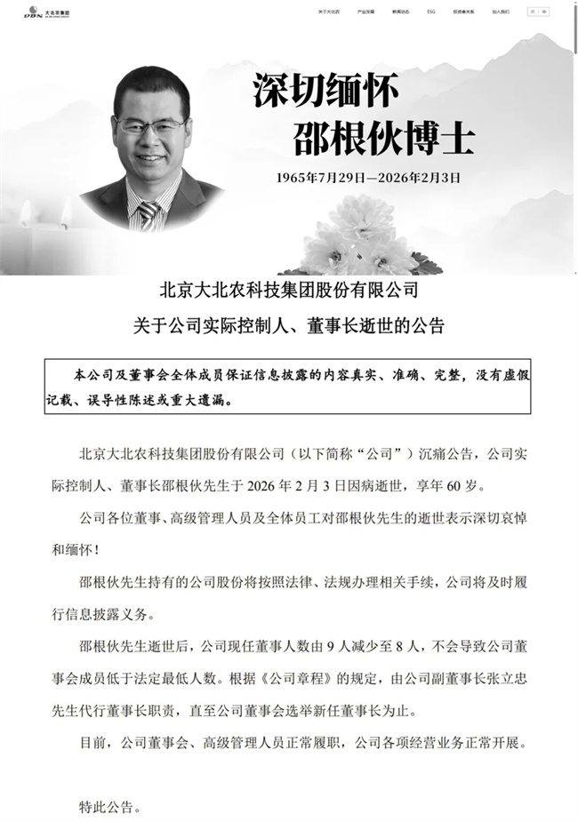 2月3日,大北农集团创始人、董事长邵根伙逝世。公司董事会于2月4日发布公告通报了这一消息,称后续事宜将按程序推进。同时披露,接下来由公司副董事长张立忠先生代行董事长职责,直至公司董事会选举新任董事长为止。