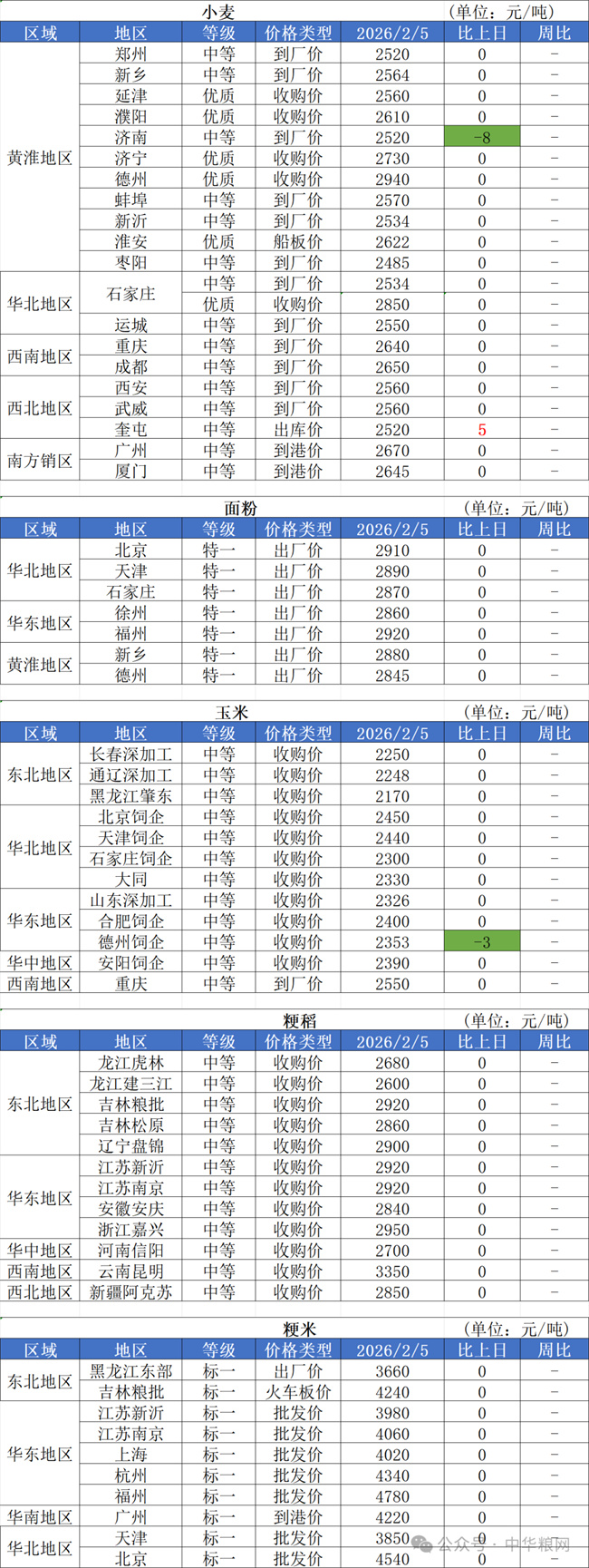 3、2月5日,主产区中晚稻价格保持平稳。粳稻各省主流收购价为:辽宁1.43-1.48元/斤、吉林1.43-1.6元/斤、黑龙江1.33-1.6元/斤、江苏1.43-1.46元/斤、安徽1.41元/斤。