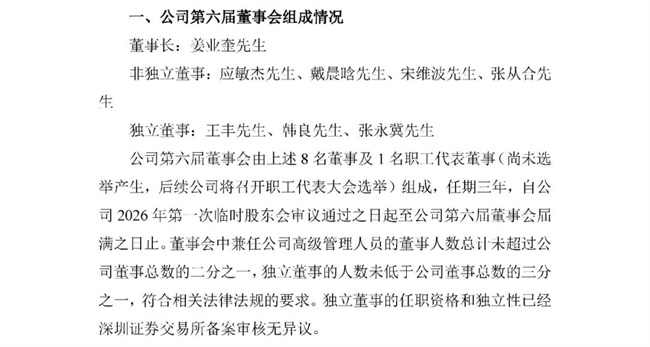 张琴届满离任,不再担任副董事长、总经理;杨仕华、黄长玲、周萍华、范斌届满离任,不再担任独立董事;夏献锋、高胜从届满离任,不再担任副总经理;应敏杰不再担任董事长,将继续担任董事;张庆一不再担任财务总监,将担任副总经理、董事会秘书。