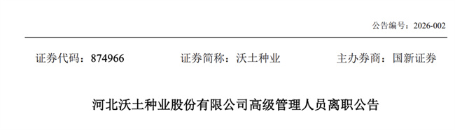2月5日,河北沃土种业股份有限公司(下称“沃土种业”)发布高级管理人员离职公告。