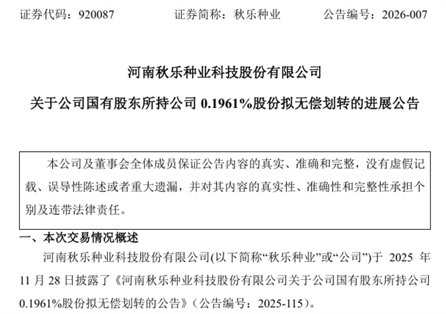 据了解,秋乐种业于2025年11月28日披露了《河南秋乐种业科技股份有限公司关于公司国有股东所持公司0.1961%股份拟无偿划转的公告》(公告编号:2025-115)。根据温县人民政府国有资产监督管理委员会(简称“温县国资委”)《关于河南秋乐种业科技股份有限公司股权划转的通知》(温国字【2025】16号),温县国资委同意将公司现股东温县农业科学研究所持有的本公司32.4万股股份无偿划转给温县农业投资有限公司。本次权益变更完成后,公司总股本仍为16,520万股,温县农业投资有限公司将持有公司32.4万股,占总股本的0.1961%。温县农业科学研究所将不再持有公司股份。