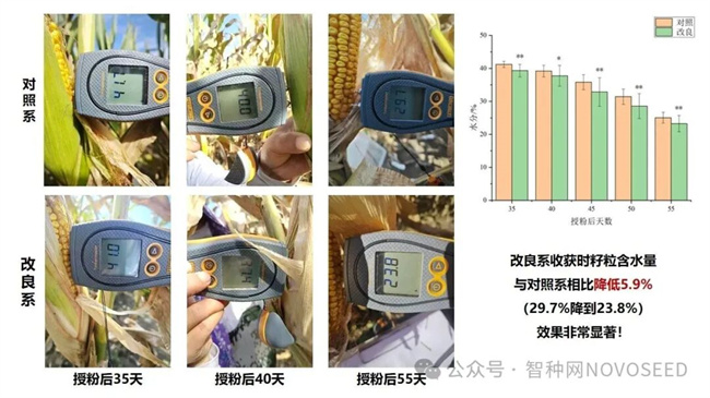 1)生理性状改良玉米。该性状是产学研深度融合取得的重大成果,直击玉米机械化收获中的核心瓶颈—籽粒脱水慢的问题。未米生物依托CasY7-WM01基因编辑系统,对快脱水关键基因ZmRPG进行精准改良,该基因为未米生物与华中农业大学严建兵教授团队联合开发,并在《Cell》杂志发表,可使玉米籽粒含水量平均降低约7%,最高降幅达17%,且不影响产量与品质。未米生物已获得该性状的独家授权,并与多家种业公司密切合作,加速推向市场。目前,未米生物正在对近20个已经商业化推广的品种开展系统性改良,这些品种2025年累计推广面积已达1660万亩,相关改良成果已陆续交付种业公司并将进入产业应用,有望在现有主流品种体系内,显著提升玉米对机械化收获的适配性,为我国玉米生产效率与减损增效带来变革性提升。