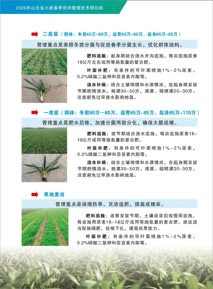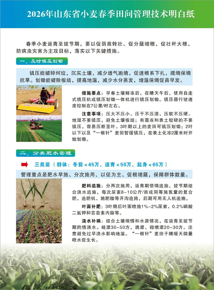 春季田间管理、促进苗情转化的黄金窗口期!管理措施跟得上,夏粮丰收有保障。为了帮助大家解决“今年小麦怎么管”的难题,省农业技术推广中心专门制作了这份《2026年山东省小麦春季田间管理技术明白纸》,图文并茂,一看就懂。建议大家收藏好,下地前翻一翻,心里更有底!