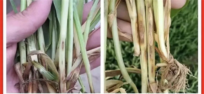 茎基腐病最初麦苗茎基部叶鞘变浅褐至褐色,中后期植株下部叶鞘变褐色,向内侵染茎秆可形成不规则褐色斑块,茎秆基部1~2节变成褐色至黑褐色,若田间湿度较大时,茎秆节的部位可产生红色或白色霉层。