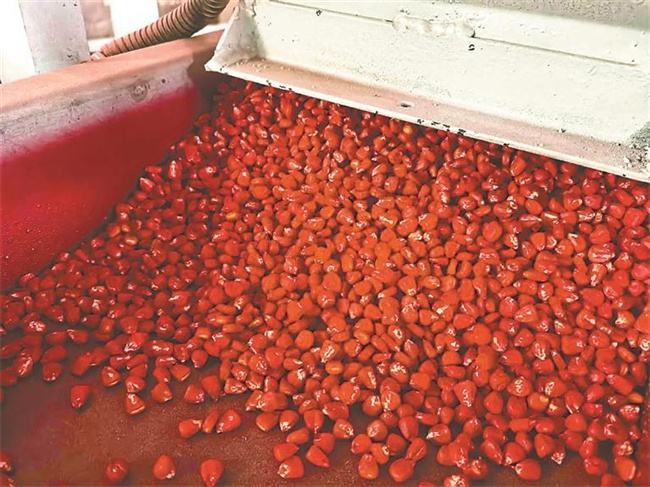 春寒料峭的2月末,黑土地上的备耕热潮悄然涌动。2月27日,记者走进黑龙江福翔臻选农业发展有限公司(简称福翔农业)加工车间。传送带上,玉米种子欢快地跳跃着。经过初选、精选、优选三道关卡,一粒粒筛选出来的金黄饱满的种子就进入了包衣环节,瞬间便穿上了一层鲜红的“外衣”,随着传送带滚动着落入包装袋。