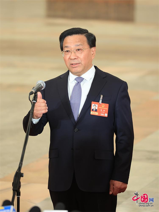 3月9日,十四届全国人大四次会议第二场“部长通道”在人民大会堂举行,农业农村部部长韩俊接受记者采访。
