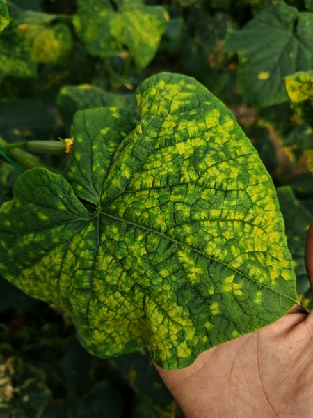 症状描述:黄瓜叶片出现多角形的黄褐色病斑,病斑扩展受叶脉限制。