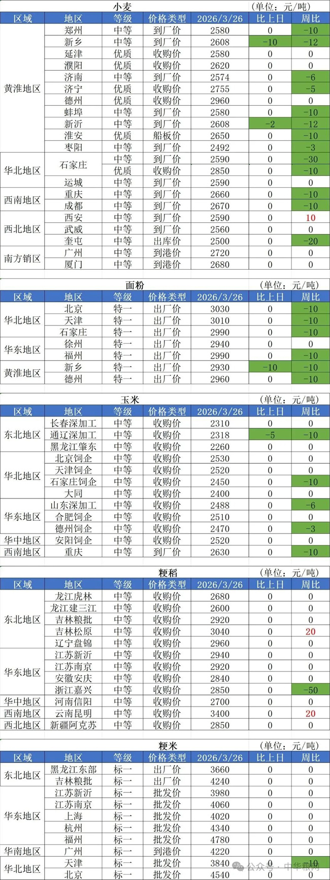 1、3月26日,小麦市场主产区收购价格继续弱势下探,落价企业主要集中山东、河北、安徽,跌幅在3-5厘。不过,河南部分终端企业开始小幅上调收购价。