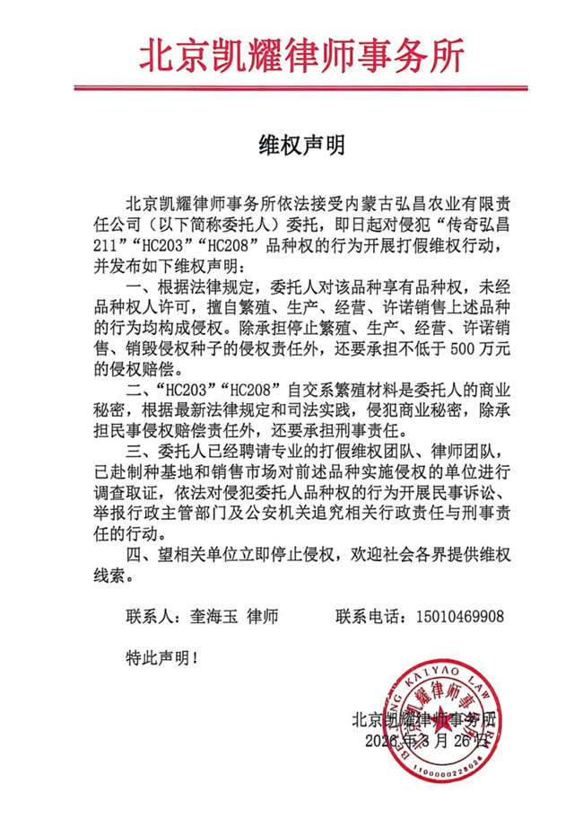 北京凯耀律师事务所依法接受内蒙古弘昌农业有限责任公司(以下简称委托人)委托,即日起对侵犯“传奇弘昌211”“HC203”“HC208”品种权的行为开展打假维权行动,并发布如下维权声明: