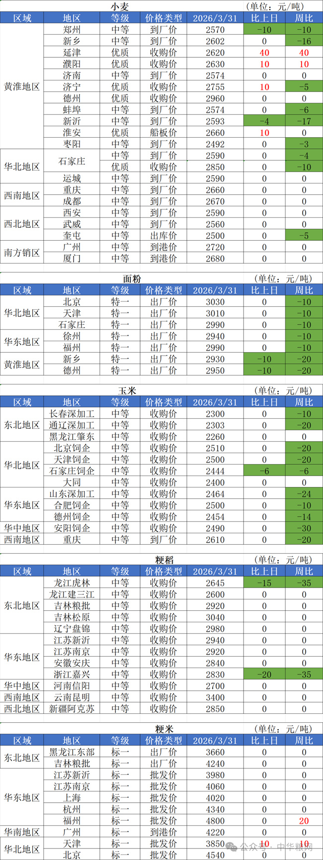 1、3月31日,小麦市场主产区报价涨跌互现,调整幅度在3-5厘。政策端保供稳价目的明确,叠加小麦饲用优势并没有继续扩大,新季小麦整体长势良好,预计麦价将窄幅震荡运行。