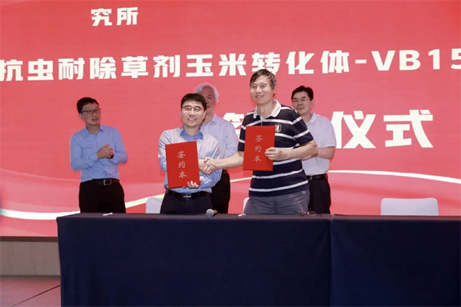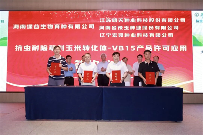 发布会现场,海南绿谷生物与中国农科院作科所签订VB15转让协议。为推动VB15尽快实现产业化应用,海南绿谷生物与豫玉种业、明天种业、辽宁宏硕种业完成了签约。从科研到品种转化,再到田间应用,链条已经打通。