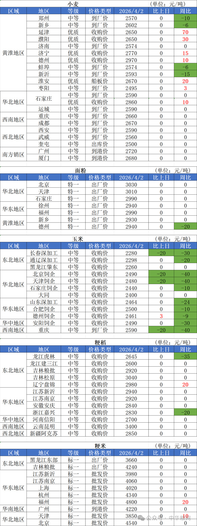 1、4月2日,国内主产区小麦收购价格整体平稳运行,部分厂家灵活调整价格。目前来看,市场供需双方博弈加剧,小麦价格下跌的趋势已停止。