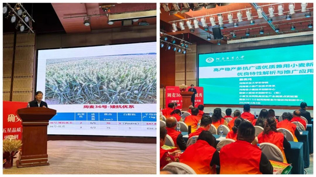 在推广应用前景方面,殷贵鸿研究员介绍,自2018年周麦36号通过国家审定后,推广面积快速增长。2018-2025年累计推广面积超过2270万亩。该品种先后获评黄淮南片区试对照品种、国家农作物优良品种推广目录小麦骨干型品种、农业农村部推介的主导品种和河南省农业主导品种,并跻身2021-2025年全国十大推广品种,市场潜力巨大。目前,已培育出了周麦36号矮抗优系,为市场推广提供了更优秀的改良品系。