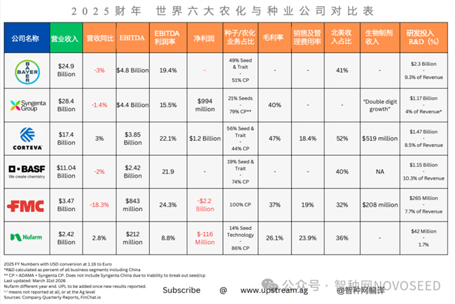 2025年全球农业科技公司财报,释放出一个不容忽视的信号。以Bayer、Syngenta、BASF为代表的农化巨头,普遍面临营收下滑与增长承压;而以Corteva为代表、种业占比更高的公司,却实现逆势增长与更高盈利能力。与此同时,“生物制剂”开始被单独列为关键指标,成为新的增长变量。这一组变化背后,并非周期波动,而是结构性转向: