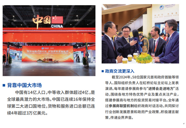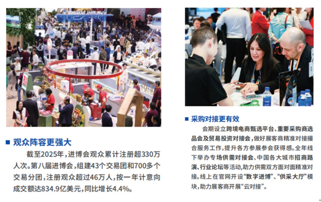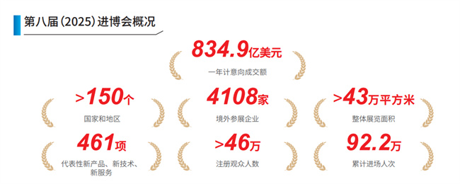 进博会简介:进博会以“新时代、共享未来”为主题,是世界上首个以进口为主题的国家级博览会,已成功举办八届。企业商业展秉持“综合展、专业办”理念,设置六大展区:农食产品、汽车及智慧出行、医疗器械及医药保健、技术装备、消费品和服务贸易。据统计,第八届进博会有150个国家和地区的4108家企业参展,意向成交金额达834.9亿美元,整体展览面积超43万平方米。