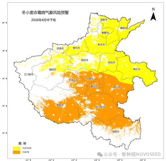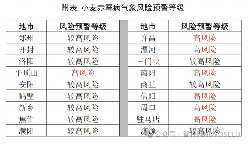 河南省农业农村厅、河南省气象局4月13日联合发布小麦赤霉病气象风险预警:目前我省大部小麦处于拔节孕穗期,豫南、豫中部分地区进入抽穗期,豫南个别地块已开花。预计4月中下旬我省将出现多轮降水过程,与小麦抽穗扬花期重叠度高,全省大部特别是黄河以南地区存在小麦赤霉病发生流行气象风险,信阳、南阳、驻马店、周口、平顶山、漯河、许昌7市赤霉病发生流行气象风险高,需重点加强防范。防御措施。