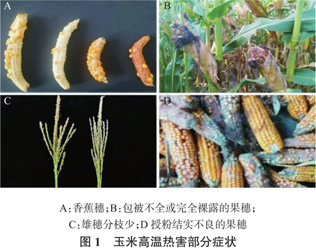 植物热胁迫可分为高温与高热两类,其中高温胁迫通常温度较低但持久,高热胁迫则时间短而温度极高,这两种胁迫均会对玉米的生长发育、生理生化指标、产量和品质产生不同程度的影响。在苗期,当遭遇日平均温度≥32℃的条件,植株生长即受抑制,表现为叶片卷曲、长势纤弱及光合能力下降;进入孕穗期后,高温热害将严重阻碍雌穗分化,导致果穗发育迟缓并形成空秆或多种畸形穗,如形状弯曲的香蕉穗(图1A)、苞叶短包被不全的乃至完全裸露的果穗等(图1B);至开花期,若出现连续3d以上日最高温≥35℃的天气,会导致雄穗分枝少、小花退化、花粉活力降低乃至败育,严重影响散粉(图1C);随后的吐丝期高温热害则会延缓雌穗吐丝,造成花期不遇,授粉结实不良(图1D)。从产量构成来看,穗粒数与千粒重这两个关键指标均受高温热害的显著负面影响;一方面通过降低花粉与花丝活力,减少有效受精,导致穗粒数显著降低;另一方面,在灌浆期间加速叶片衰老,削弱光合作用,致使同化物供应不足、籽粒灌浆受阻,最终造成千粒重下降与产量锐减,严重时减产幅度可超过30%。