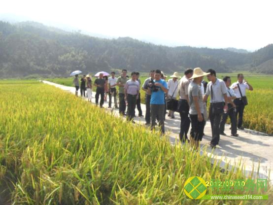 代表们现场观摩了优质稻新品种示范片和水稻新品种展示点,今年优质稻新品种示范片面积1012亩,其中核心示范片205亩,示范甬优9号、天优华占两个组合。新品种展示点共展示川优2189、泰优2098、赣优066、川优410、谷优419、川优346、赣优496、特优116、谷优066、特优066、谷优769、热粳优35、纳科2号、深优979、Y两优646、两优996、福两优366、甬优15等18个组合。