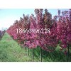 王族海棠   乔木,高6~7m,树型直立,树冠圆形,枝条暗紫红色,叶片椭圆形,锯齿钝。春、夏、秋三季其叶色始终以紫色为基调深浅变化,叶片上有金属般的光亮,整个树给人以光彩四溢的感觉。4月上旬始花,花蕾暗黑红色,开后逐渐转为暗红色至深紫红色;花瓣6~10数,排成两轮,花梗直立,花直径5cm,花萼筒紫黑色,光滑,萼齿细长,内被稀毛。果实球形,黑红色,直径1.5cm,表面被霜状蜡质。果萼宿存,是最具观赏价值的紫叶品种。