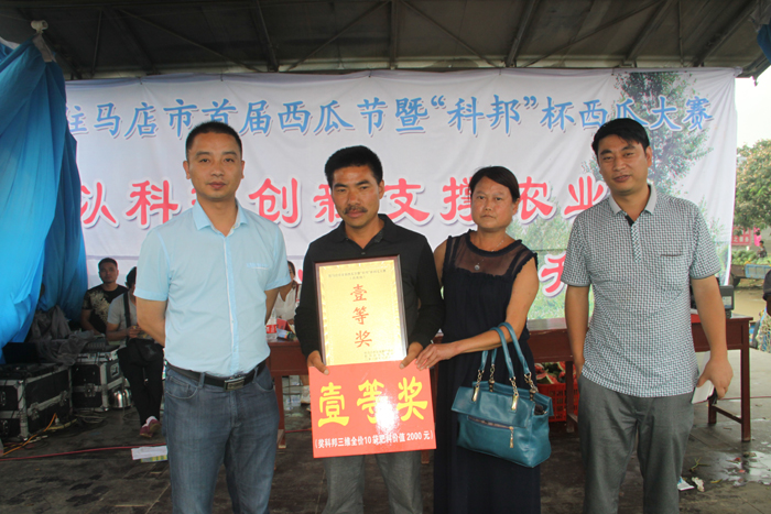 综合奖项 ,由专家对参赛西瓜的外观品质、农药残留、口感以及糖分进行评测打分排名,确定获奖编号种植户。西瓜重量冠军比赛,由专家对参赛西瓜的单瓜重量称量,确定获奖编号种植户。中午时分,大赛评出西瓜综合品质奖和重量奖。综合品质奖最甜西瓜一等奖被汝南县板店乡瓜农魏永红夺得。确山县瓦岗镇瓜农赵永军一个重16.35公斤的西瓜赢得最重“瓜王”称号。出席西瓜节等领导专家为获奖者进行了颁奖,分别奖励了科邦肥料1~10袋。据“最重瓜王”赵永军和“最好吃最甜瓜王” 魏永红介绍自己的种瓜经验时,他们都向瓜农透漏施用了一种秘密武器“科邦品牌的三维全价生态肥配套科邦138”,这种肥料集合了高效活性菌体、高能生物质、无机养分螯合体国内独家专利发明肥料,具有增产幅度大、改善农作物品质量、养地培肥地力等多种独特优势。确山县花果山种植合作社理事长吕晓明、唐河县代理商葛栋也高度评价了科邦肥料的大幅度抗旱增产和改善果实品质的显著效果。