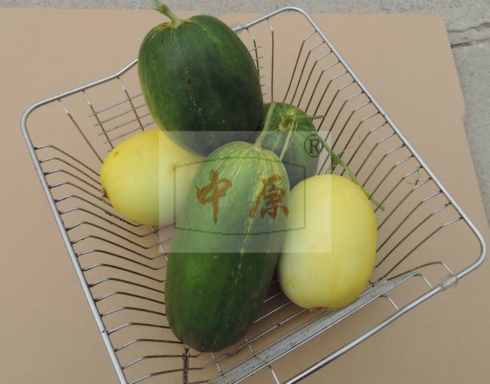 郑州中原西甜瓜研究所最新研制厚薄皮杂交一代甜瓜品种。早熟,果实发育30天左右。植株生长强健,坐果力强,一株多果,不脱落蒂。果实圆筒形,果实纵经长20厘米,横经8.5厘米。果形丰满整齐,果皮翠绿色,肩部略带放射状微黄色纹理。果肉纯白色,肉质细脆多汁香甜,具备厚皮甜瓜的产量和薄皮香瓜口感。含糖量高达15~17%。单瓜重约750~1100克,耐病性较强,耐贮运,适合露地和保护地栽培。