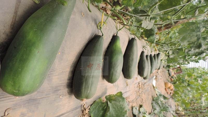 郑州中原西甜研究所最新育成羊角蜜杂种。羊角蜜是农家常规品种,瓜农习惯自己留种,因此种性严重退化,不抗病,糖度低、瓜小产量低,瓜形皮色不一致。真对上述原因利用现代育种手段选育代替品种显得及其重要。我们首先对羊角蜜进行多代提纯复壮,选取优良单株作母本杂交。后代观察5※11比较复合育种目标,杂交优势明显。经2013年冬季云南耿马试验和2014年春昌乐,河南中牟大棚试种,周口扶沟大李庄乡露地试验结果表现:早熟性与羊蜜相当,高温季节栽培花后25天采收。雌花早生,而密。第一雌花着生在子蔓第一片叶液间,以后一片叶一个雌花。子蔓、孙蔓均可结瓜,连续结瓜性强,单株结4~9个。果形长棒锤形,纵径26cm,横径8cm,肉厚2cm。皮色墨绿,肉绿色,瓜瓤桔红色。肉厚种腔小。熟瓜香酥脆甜多汁,适口性极佳,科学含糖度15%。单瓜重1-2kg,亩产5000kg左右。产量与羊角蜜比较提高20%。抗病性超越羊角蜜,田间观察对照白粉病、角斑病、霜霉病发病率降低。抗逆性强适应广。适宜各甜瓜产区各种栽培模式种植。露地栽培对整枝打杈要求不严格,管理粗放,很适合大面积懒汉种植。杂交后代外观形状与羊角蜜区别较大,所以新命名:中原口福香瓜