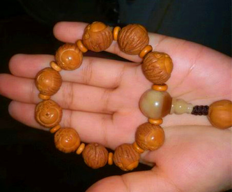5. 雕刻品用途广泛,“玩法”多样。业内人士通常把核雕品的玩法分为三种(有人称为三种制式),即单个、成对和串活。单个和成对,其实就是大家常说的挂件和摆件;而串活则指的是作为串珠(念珠),制成手串、项串等。对于果个较大、所雕题材内容比较完整的美国猴头核桃雕刻品,可用作挂件或摆件,例如作为手机坠、手包坠、扇子坠、汽车内挂等,或摆于案头欣赏、握于手中把玩。对于果个较小、所雕题材相对简单的美国猴头核桃雕刻品(通常是猴头),当然是制作手串、长串的首选。需要说明的是,除了雕刻外,对于果形圆、果个小、果壳表面纹路美观的美国猴头核桃,就没有必要雕刻了,直接用素珠穿串,即可成为上品;磨光珠穿串也是一种不错的选择。