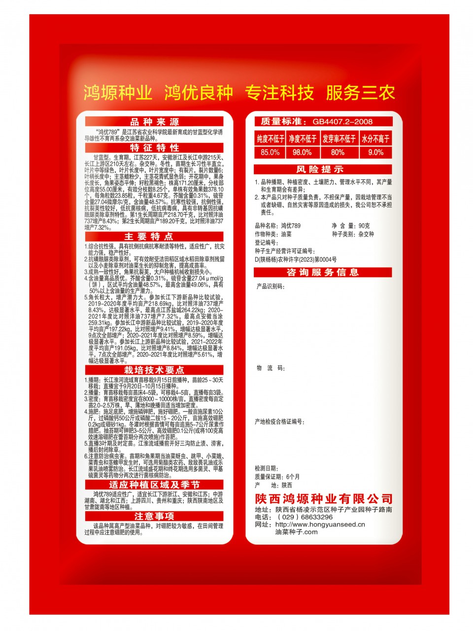 陕西鸿塬种业有限公司独家拥有油菜品种“鸿优789”(品种登记编号:GPD油菜(2024)320201)的生产经营权和品种维护权。