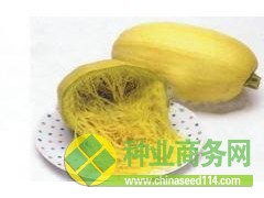 金丝瓜又叫金瓜,原产美洲,是瓜类菜中的稀有品种,目前正处于开发阶段、金丝瓜老嫩均可食用,一般以食用成熟的老瓜为主,成熟后的金丝瓜为金黄色、椭圆形、外观美、外皮坚硬,单瓜一般重1—2公斤,食用时将其热煮5—6分钟或低温冷冻自然融化后,去掉籽瓤和薄皮后,瓜肉就成为粗细均匀,晶莹脆嫩、金黄色的奇特粉丝,金粉丝可凉拌、热炒、油炸、涮锅、做汤、做馅等。人们称其为金粉丝或植物海蛰,不仅外观好看,而且美味可口。金丝瓜浑身是宝,具有广阔的市场和较好的开发前景。金丝瓜的瓜籽色白粒大,是上好的炒货原料。金丝瓜的皮和瓤可做饲料用。金丝瓜主食部分金丝瓜的营养价值高于其它瓜类蔬菜,每百克含粗蛋白1.5克,粗脂肪1.17克,碳水化合物48.3克,铁73.7克,谷氨酸、天门冬酸等许多种人体必须的氨基酸,在医疗方面,对糖尿病有较好的疗效。金丝瓜适应性较强,凡能种南瓜的地方都可种植。金丝瓜生长期100天左右,病虫害较少,栽培简单,不用搭架。金丝瓜产量较高,一般亩产6000-7000斤。金丝瓜耐贮运,长途运输也不会损坏,在常温下可保存2-3个月,在冷藏下可周年存放。