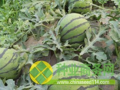 特征特性 :早熟西瓜杂种一代。植株生长势较强,第一雌花平均节位8.7节,果实发育期28-30天。单瓜质量12公斤,果实高圆形,果型指数1.05,果皮绿色覆细齿条,有蜡粉,皮厚1.0厘米,果皮较脆。果肉深红色,中心折光糖含量12.9%,边糖含量9.6%。果实商品率98.5%,枯萎病苗期室内接种鉴定结果为高感。