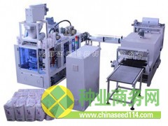 直线输送码包机与热收缩自动封切:直线输送码包机对包装后的砖形纸袋码成一定组列-缠绕膜---送入热收缩机---成型产品