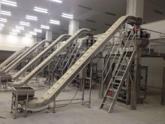 该机组为冷冻类产品专用包装机组,提升设备采用我公司生产的大倾角提升机,该提升机有输送简单清理方便的优点,由提升机把物料提升到称量机的料仓, C