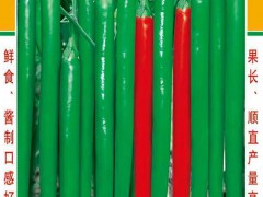 该品种属中熟长线椒品种。植株生长势较强,株型好,分枝多,叶片小,果顺直,长22厘米左右,果宽约1.5厘米。青果深绿色,老熟果红色鲜艳,果实硬度好,耐储运,单果重22克左右,口感好,味辣,有香味,坐果性好,综合抗性强,适合藓椒上市或酱制加工。