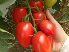 罗曼型大红番茄,无限生长型,早熟,果实长椭圆型,萼片平展,每穗坐果数8-10个,单果重80克左右,坐果均匀一致,可成串采收,连续坐果能力强,硬度好,口感好。高抗番茄黄化曲叶病毒病、抗根结线虫等,适合北方春秋大棚或南方露地种植。