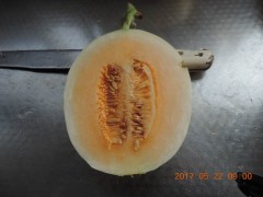 郑州中原西甜瓜研究所新育成一代交配厚皮甜瓜新品种—中原红心脆2号。该品种早中熟,瓜短椭圆形,皮乳白色,肉桔红,肉质松脆爽口,口感风味俱佳,中心糖19~21%,雌花开放至成熟果实发育需33天左右。单果重1~1.5公斤左右。管理得当一般亩3000公斤左右。植株长势强健,不早衰,易坐果,货架期长,耐贮运。适合各地保护地种植及西北干旱露地种植。